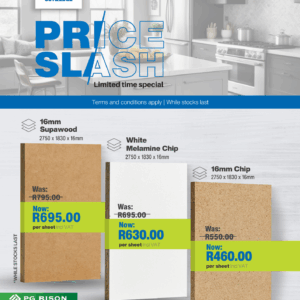 Revamp your space with our Summer Promotion! Elevate your interior design with top-quality boards and cabinet fittings at unbeatable prices. Whether you're upgrading your kitchen, renovating your office, or enhancing your living room, our selection offers the perfect blend of functionality and style. Don't miss out on this opportunity to transform your space into a masterpiece. Shop now and bring your vision to life! Click the link to view our specials. Please visit your PBC Vereeniging branch for In-store specials.