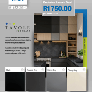 Introducing the All-New Tavole PureMatt Range Looking to add a touch of elegance and modern style to your space? The Tavole PureMatt boards are designed with a smooth, soft-touch ultra-matt finish that feels as good as it looks. Choose from four beautiful, timeless colours – Black, Graphite Grey, Dolphin Grey, and Cloudy Grey – to bring your vision to life. Whether it’s for a luxury kitchen, sleek wardrobe, or a standout interior project, PureMatt gives you the perfect balance of style, sophistication, and lasting quality. Now available exclusively at Plaza Board Centre Gauteng & Rustenburg, PureMatt makes premium design more accessible than ever. Upgrade your next project with PureMatt – where modern design meets everyday luxury. Click the image below to view our range of products on special in our online catalogue.