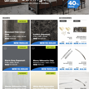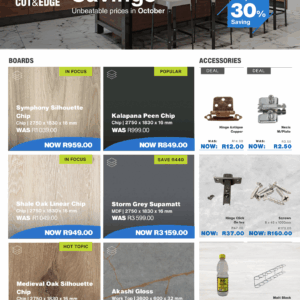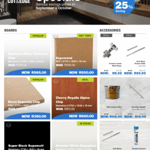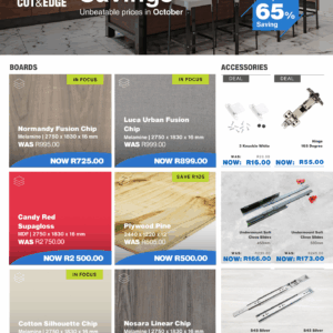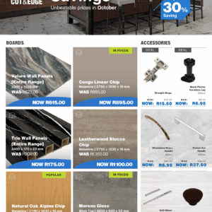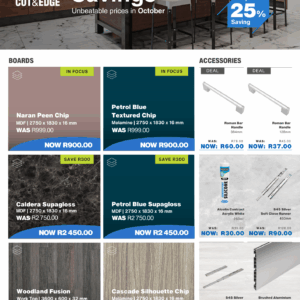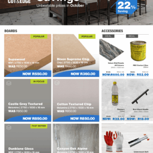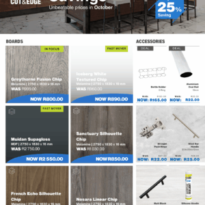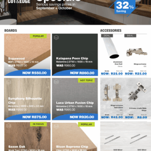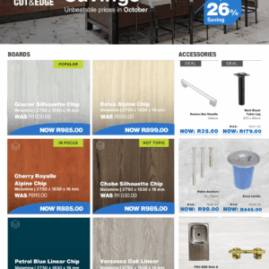 Revamp your space with our Spring Promotion! Elevate your interior design with top-quality boards and cabinet fittings at unbeatable prices. Whether you're upgrading your kitchen, renovating your office, or enhancing your living room, our selection offers the perfect blend of functionality and style. Don't miss out on this opportunity to transform your space into a masterpiece. Shop now and bring your vision to life! Click the link to view our specials. Please visit your PBC Durban branch for In-store specials.