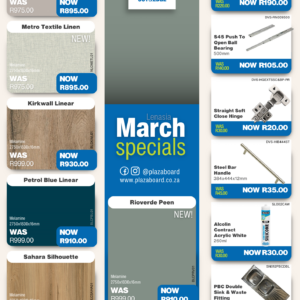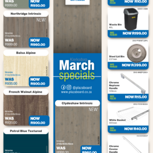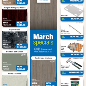 Revamp your space with our March Promotion! Refresh your interiors this February with our exclusive board and cabinet fitting specials. Designed for quality, durability, and modern finishes, our range is ideal for kitchens, offices, and custom projects. Upgrade your space with confidence and value. View our February specials now and start building better. Click the link to view our specials. Please visit your PBC Randfontein branch for In-store specials.