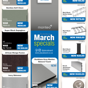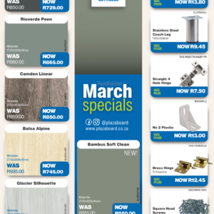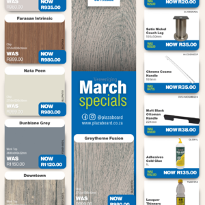 Revamp your space with our March Promotion! Refresh your interiors this February with our exclusive board and cabinet fitting specials. Designed for quality, durability, and modern finishes, our range is ideal for kitchens, offices, and custom projects. Upgrade your space with confidence and value. View our February specials now and start building better. Click here to see products on special Please visit your PBC Lenasia branch for In-store specials.