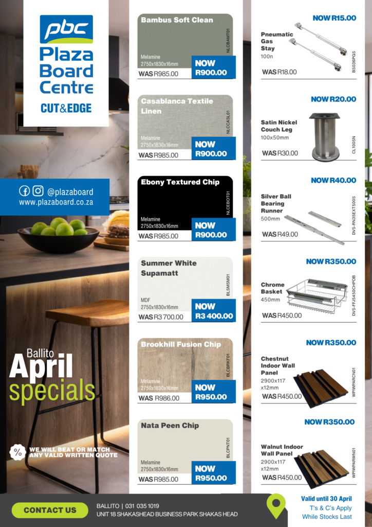 Refresh your interiors this April with our exclusive board and cabinet fitting specials. Designed for quality, durability, and modern finishes, our range is ideal for kitchens, offices, and custom projects. Upgrade your space with confidence and value. View our February specials now and start building better. Click on the link to view our specials.