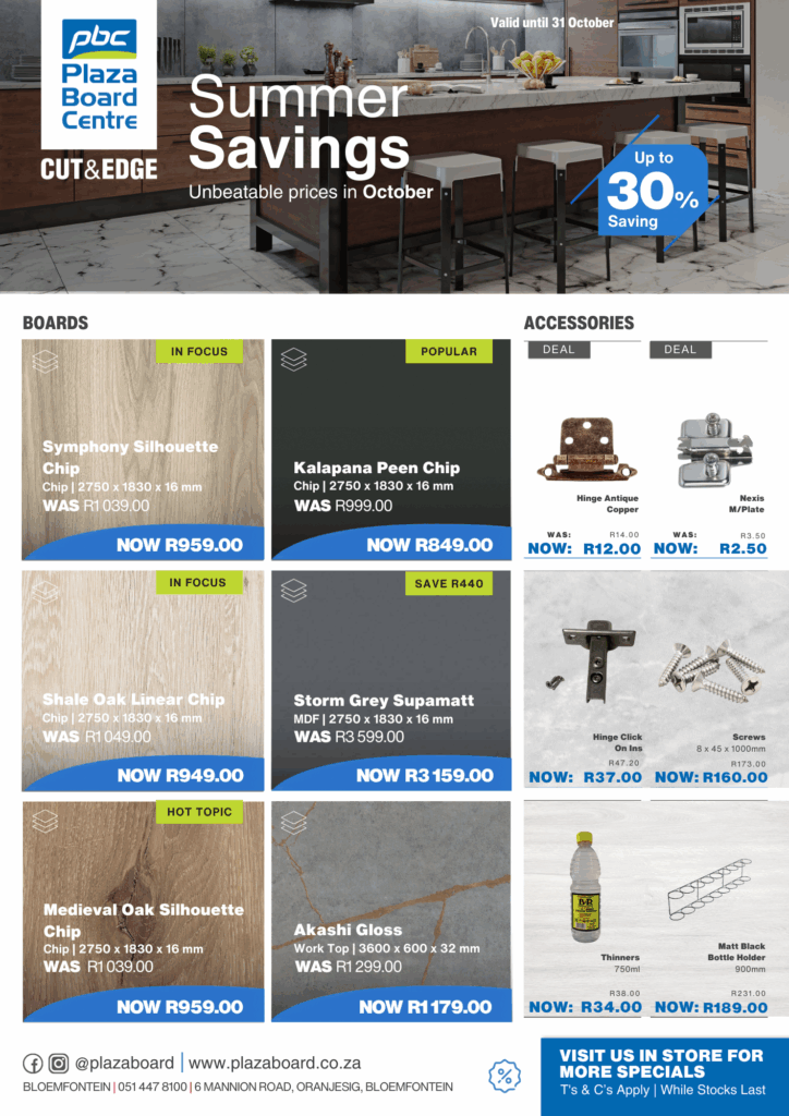 Elevate your interior design with top-quality boards and cabinet fittings at unbeatable prices. Whether you're upgrading your kitchen, renovating your office, or enhancing your living room, our selection offers the perfect blend of functionality and style. Don't miss out on this opportunity to transform your space into a masterpiece. Shop now and bring your vision to life! Click the link to view our special.