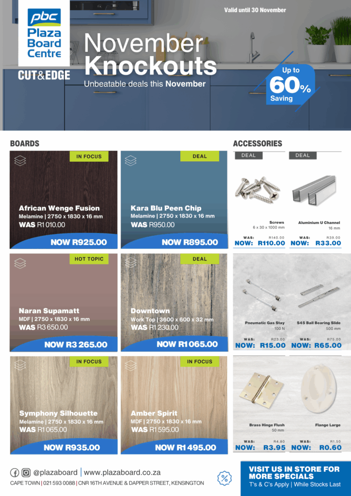 Elevate your interior design with top-quality boards and cabinet fittings at unbeatable prices. Whether you're upgrading your kitchen, renovating your office, or enhancing your living room, our selection offers the perfect blend of functionality and style. Don't miss out on this opportunity to transform your space into a masterpiece. Shop now and bring your vision to life! Click the link to view our special.