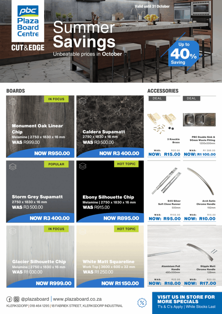 Elevate your interior design with top-quality boards and cabinet fittings at unbeatable prices. Whether you're upgrading your kitchen, renovating your office, or enhancing your living room, our selection offers the perfect blend of functionality and style. Don't miss out on this opportunity to transform your space into a masterpiece. Shop now and bring your vision to life! Click on the link to view our specials.