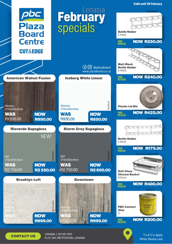 Refresh your interiors this February with our exclusive board and cabinet fitting specials. Designed for quality, durability, and modern finishes, our range is ideal for kitchens, offices, and custom projects. Upgrade your space with confidence and value. View our February specials now and start building better. Click here to see products on special