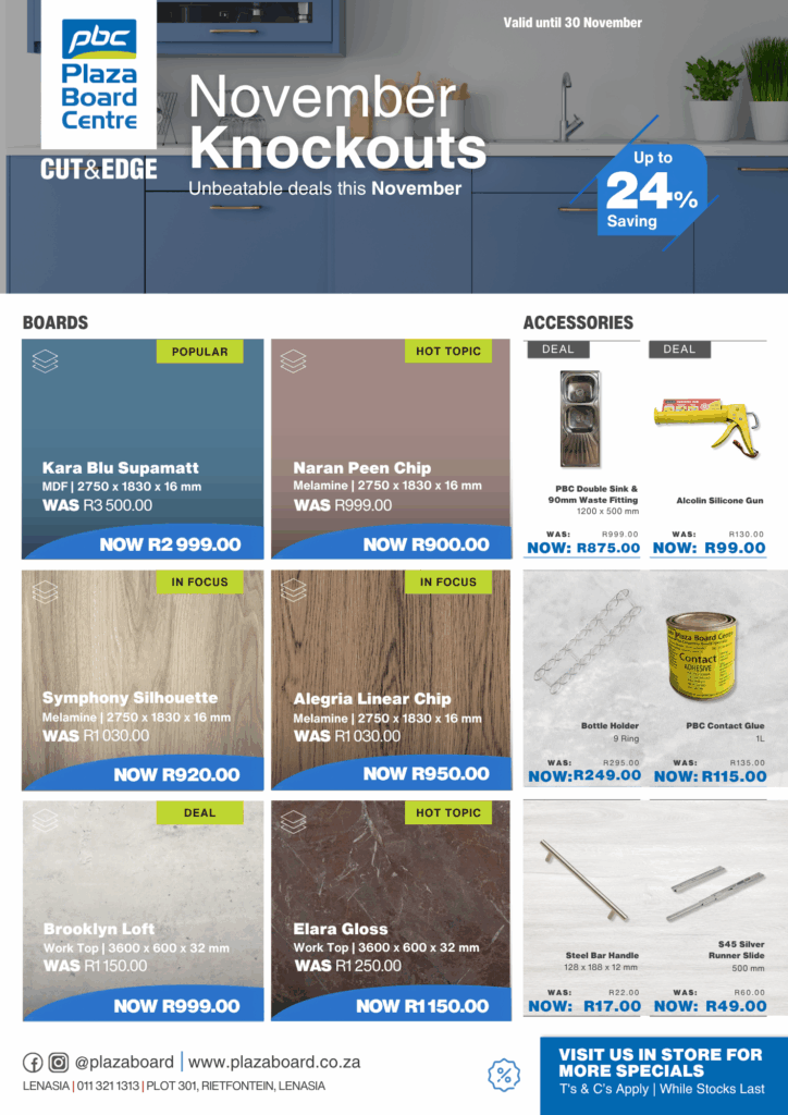 Elevate your interior design with top-quality boards and cabinet fittings at unbeatable prices. Whether you're upgrading your kitchen, renovating your office, or enhancing your living room, our selection offers the perfect blend of functionality and style. Don't miss out on this opportunity to transform your space into a masterpiece. Shop now and bring your vision to life! Click here to see products on special