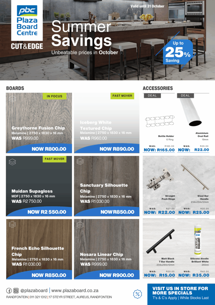 Elevate your interior design with top-quality boards and cabinet fittings at unbeatable prices. Whether you're upgrading your kitchen, renovating your office, or enhancing your living room, our selection offers the perfect blend of functionality and style. Don't miss out on this opportunity to transform your space into a masterpiece. Shop now and bring your vision to life! Click the link to view our specials.