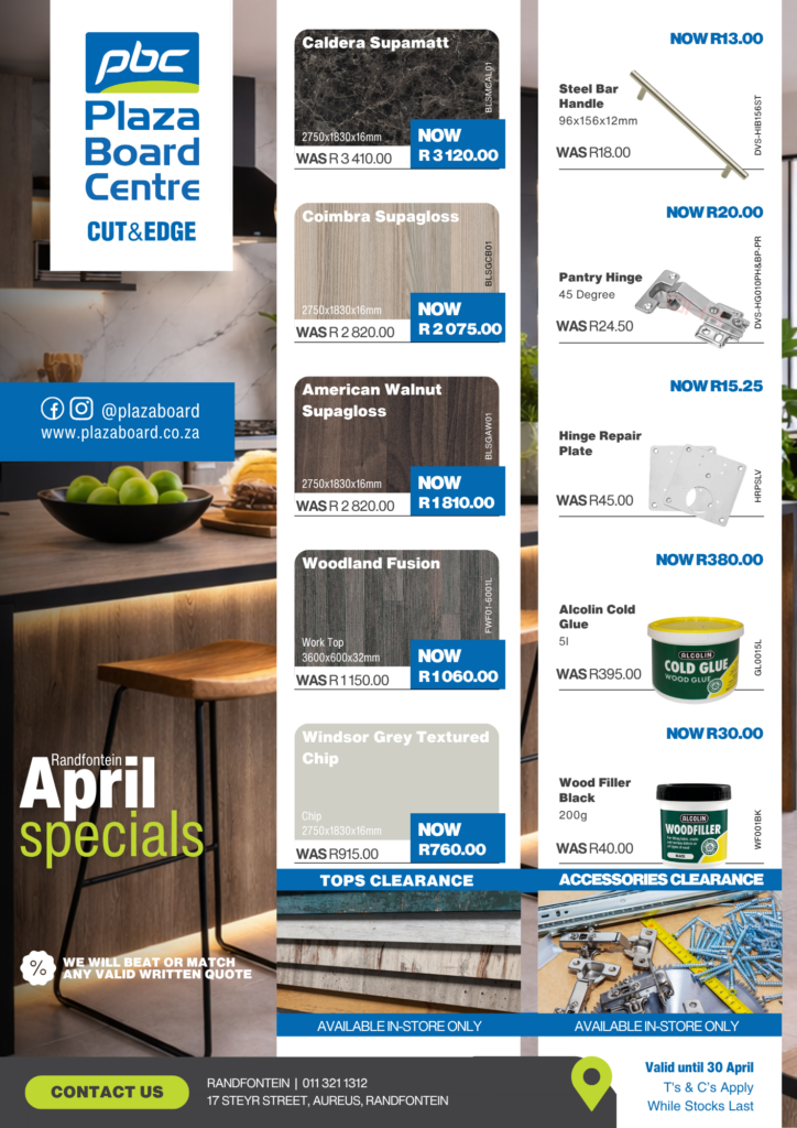 Refresh your interiors this February with our exclusive board and cabinet fitting specials. Designed for quality, durability, and modern finishes, our range is ideal for kitchens, offices, and custom projects. Upgrade your space with confidence and value. View our February specials now and start building better. Click the link to view our specials.