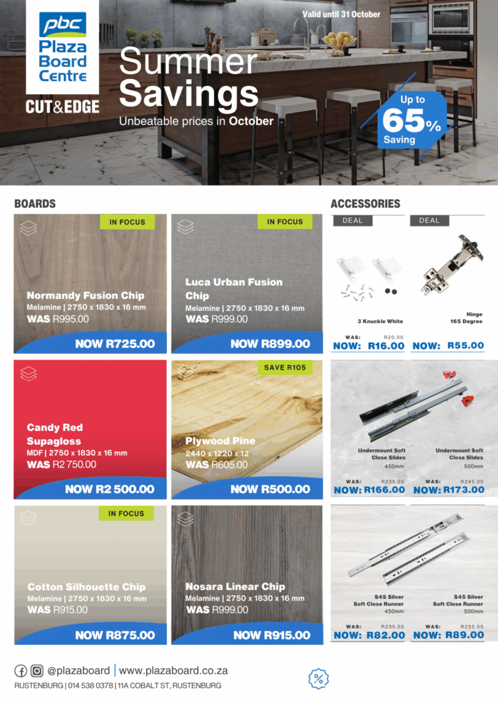 Elevate your interior design with top-quality boards and cabinet fittings at unbeatable prices. Whether you're upgrading your kitchen, renovating your office, or enhancing your living room, our selection offers the perfect blend of functionality and style. Don't miss out on this opportunity to transform your space into a masterpiece. Shop now and bring your vision to life! Click the link to view our specials.